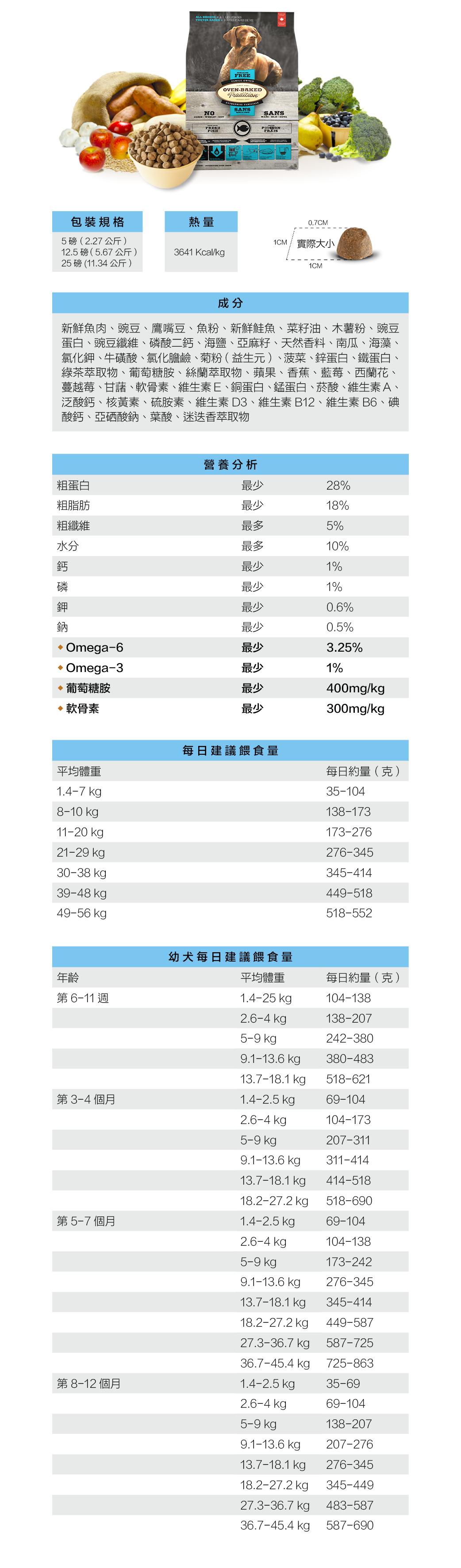 ▶營養分析:粗蛋白28.00%、粗脂肪18.00%、粗纖維5.00%、水分10.00%、鈣1.10%、磷1.00%、鉀0.60%、鈉0.50%、Omega-6 3.25%、Omega-3 1.00%、葡萄糖胺400mg/kg、軟骨素300mg/kg。