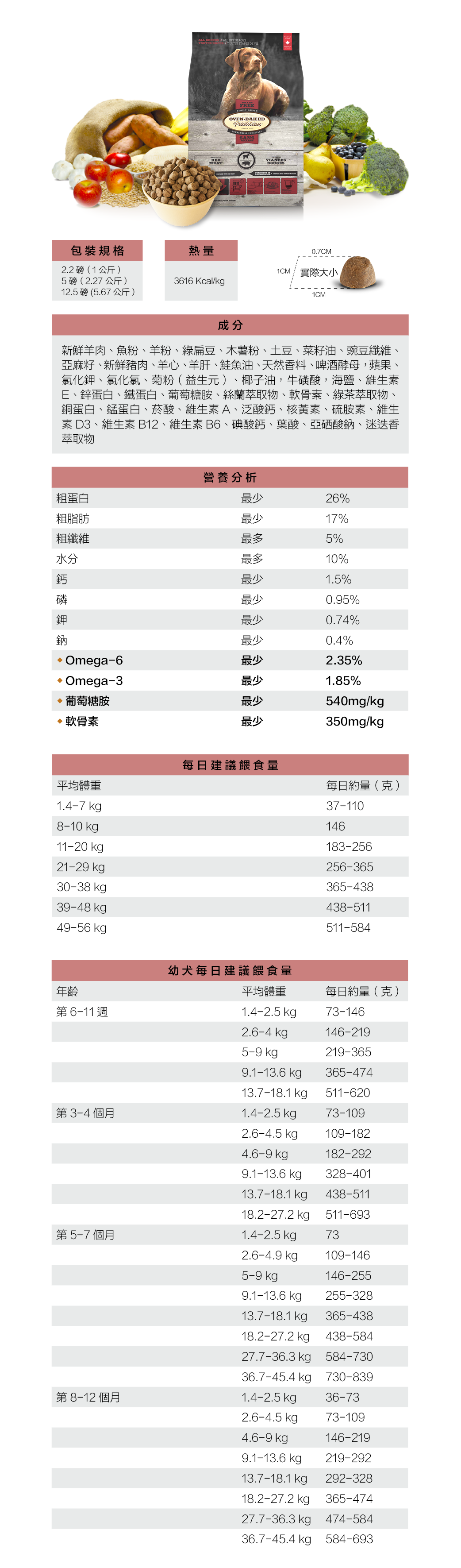 ▶營養分析:粗蛋白26.00%、粗脂肪17.00%、粗纖維5.00%、水分10.00%、鈣1.50%、磷0.95%、鉀0.74%、鈉0.40%、Omega-6 2.35%、Omega-3 1.85%、葡萄糖胺540mg/kg、軟骨素350mg/kg。