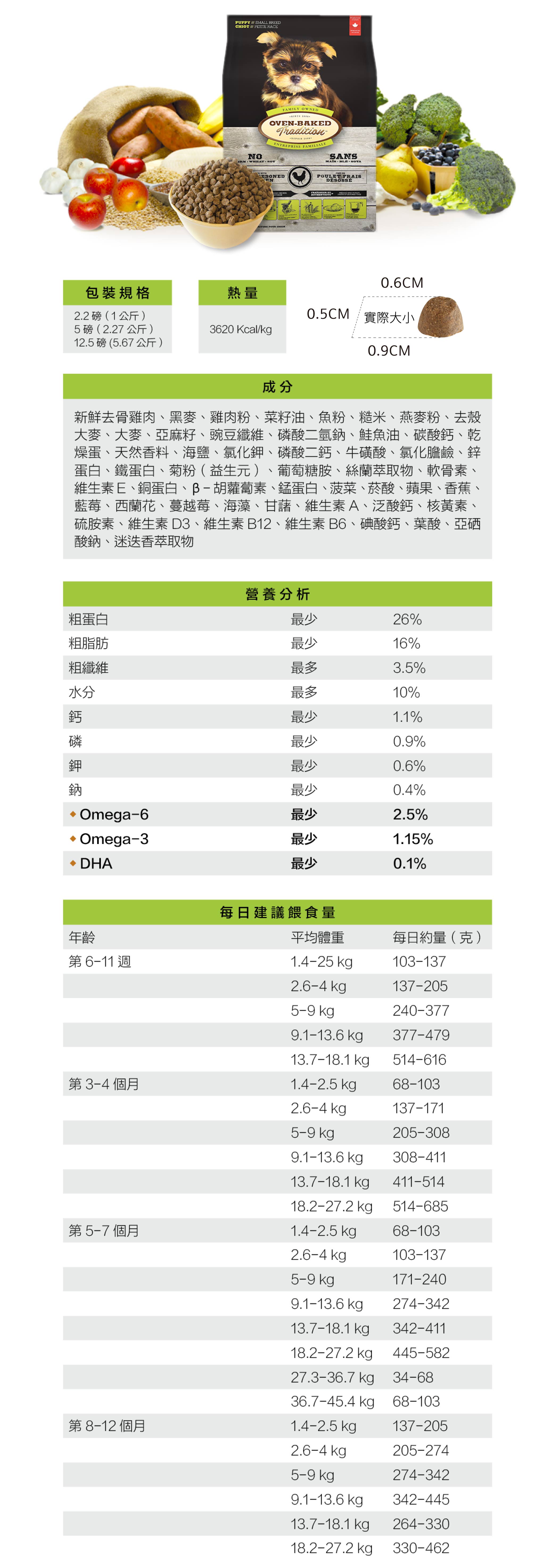 ▶營養分析:粗蛋白26.00%、粗脂肪16.00%、粗纖維3.50%、水分10.00%、鈣1.00%、磷0.90%、鉀0.60%、鈉0.40%、Omega-6 2.50%、Omega-3 1.15%、DHA 0.10%