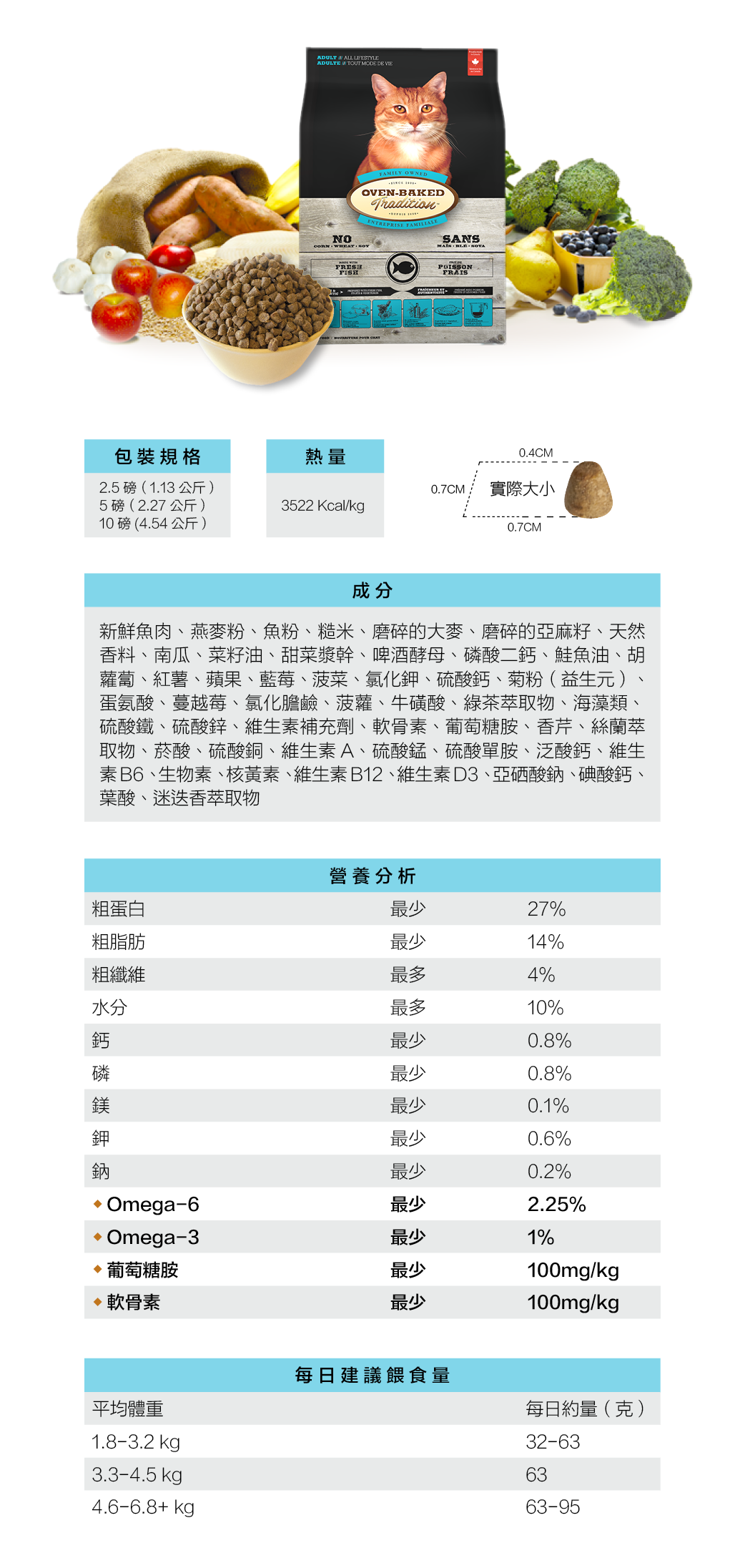 ▶主要成份:新鮮魚肉、燕麥粉、魚粉、糙米、磨碎的大麥、磨碎的亞麻籽、天然香料、南瓜、菜籽油、甜菜漿、啤酒酵母、磷酸二鈣、鮭魚油、胡蘿蔔、紅薯、蘋果、藍莓、菠菜、氯化鉀、硫酸鈣、菊粉(益生元)、蛋氨酸、蔓越莓、氯化膽鹼、菠蘿、牛磺酸、綠茶萃取物、海藻類、硫酸鐵、硫酸鋅、維生素補充劑、軟骨素、葡萄糖胺、香芹、絲蘭萃取物、菸酸、硫酸銅、維生素A、硫酸錳、硫酸單胺、泛酸鈣、維生素B6、生物素、核黃素、維生素B12、維生素D3、亞硒酸鈉、碘酸鈣、葉酸、迷迭香萃取物。