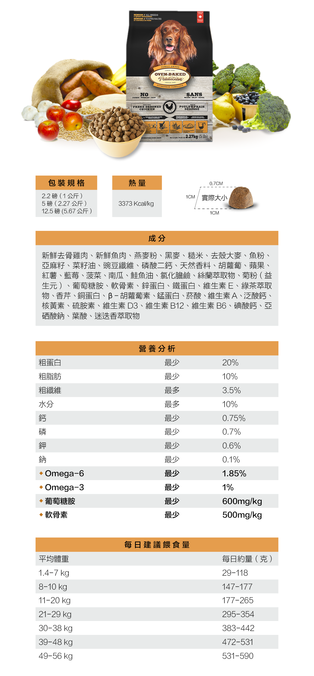 ▶營養分析:粗蛋白20.00%、粗脂肪10.00%、粗纖維3.50%、水分10.00%、鈣0.75%、磷0.70%、鉀0.60%、鈉1.00%、Omega-6 1.85%、Omega-3 1.00%、葡萄糖胺600mg/kg、軟骨素500mg/kg。