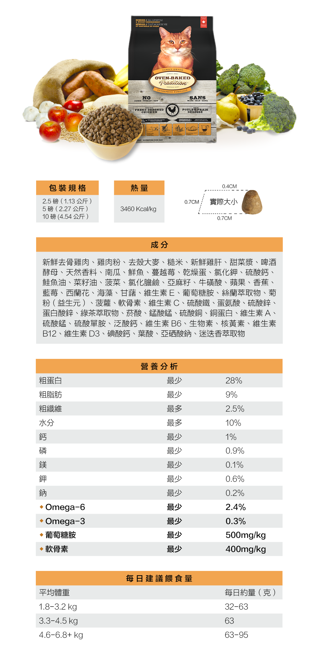 ▶營養分析:粗蛋白28.00%、粗脂肪9.00%、粗纖維2.50%、水分10.00%、灰分8.00%、鈣1.00%、磷0.90%、鎂0.10%、鉀0.60%、鈉0.20%、Omega-6 2.40%、Omega-3 0.30%、葡萄糖胺500mg/kg、軟骨素400mg/kg。