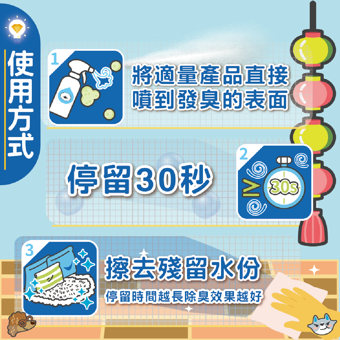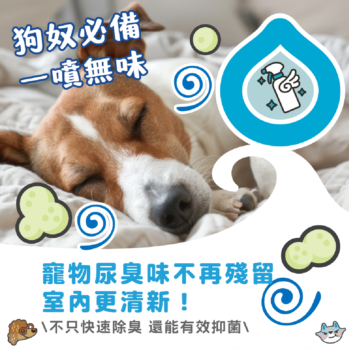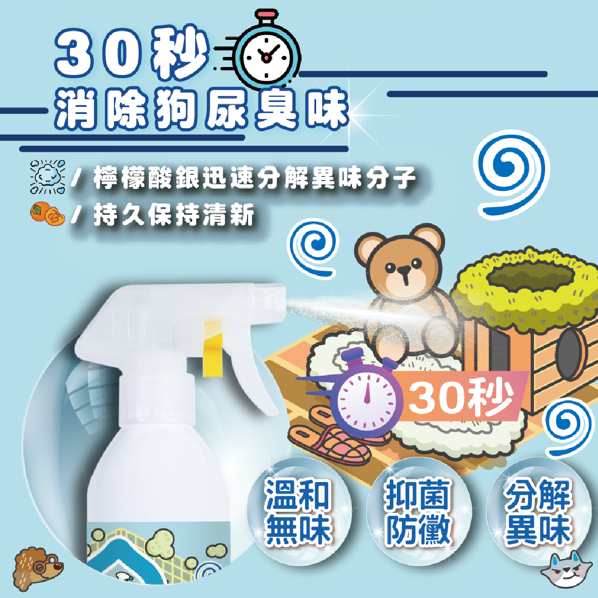 輕輕一噴30S快速消臭,同時分解多種寵物異味,省時省力