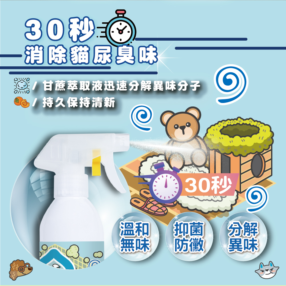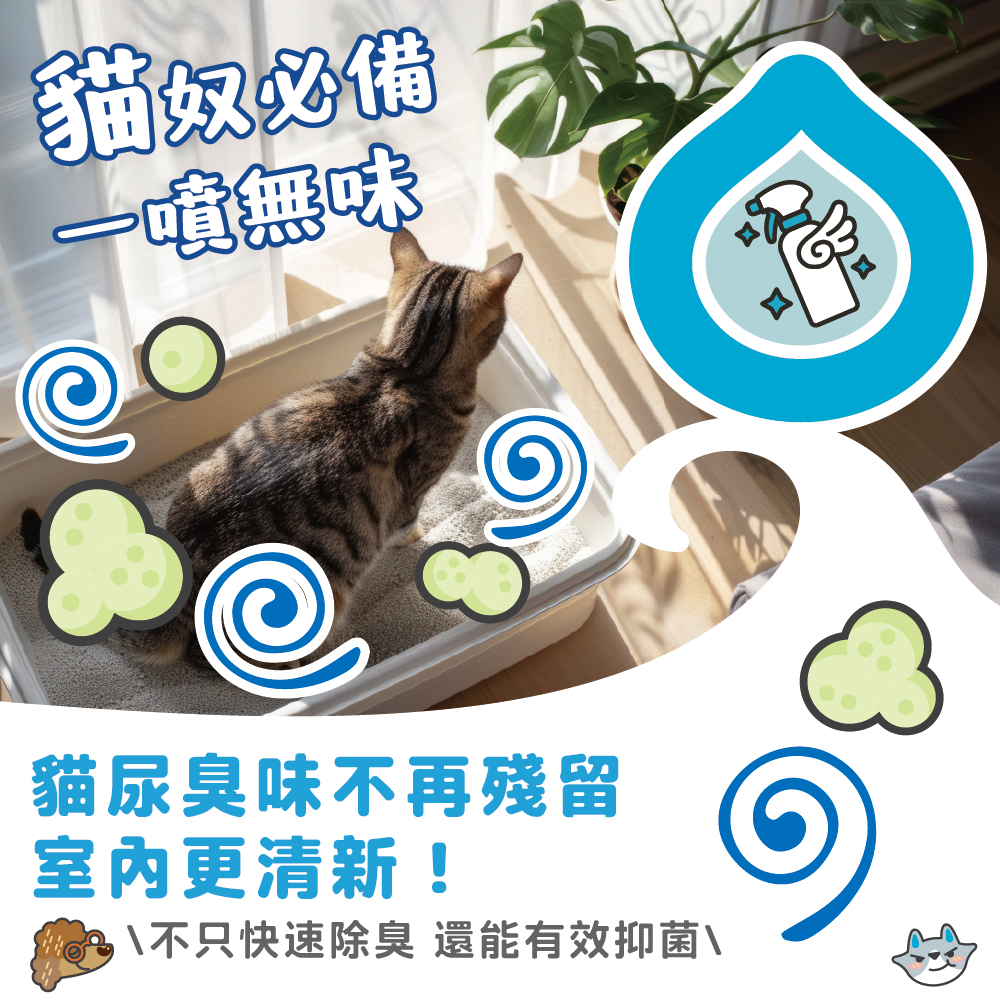 採用天然植物多酚消臭成份,寵物除臭、貓砂去味好幫手