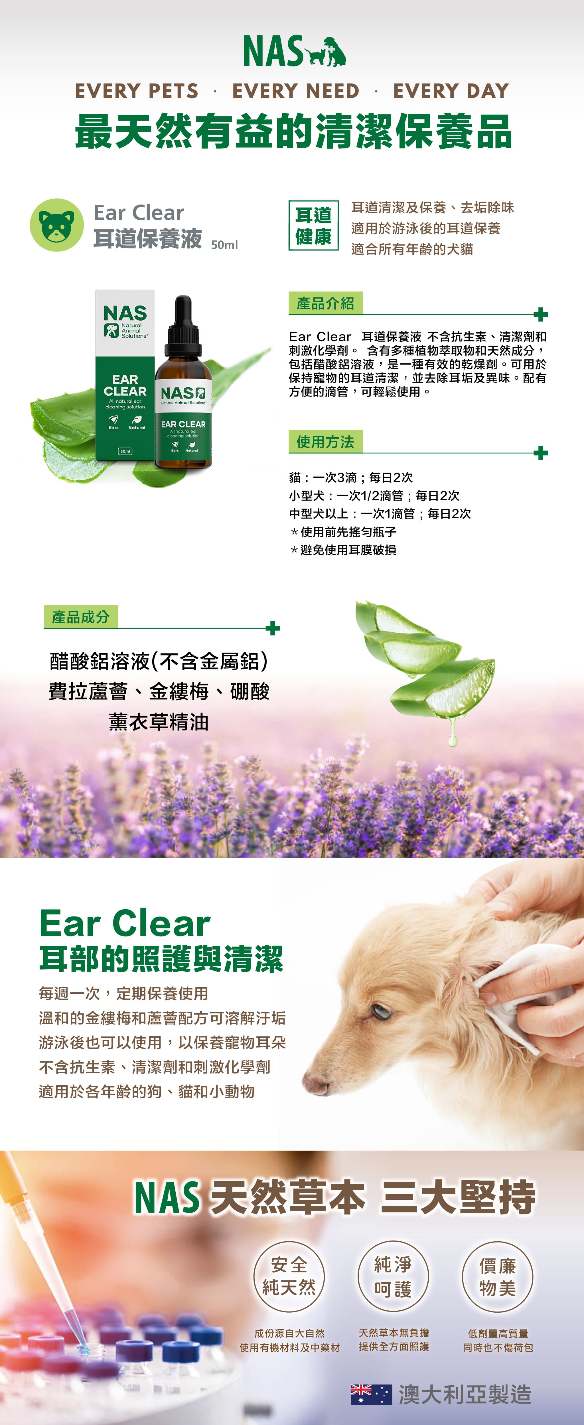 含有多種植物萃取物和天然成分,不含抗生素、清潔劑和刺激化學劑,能清除耳垢及異味。
