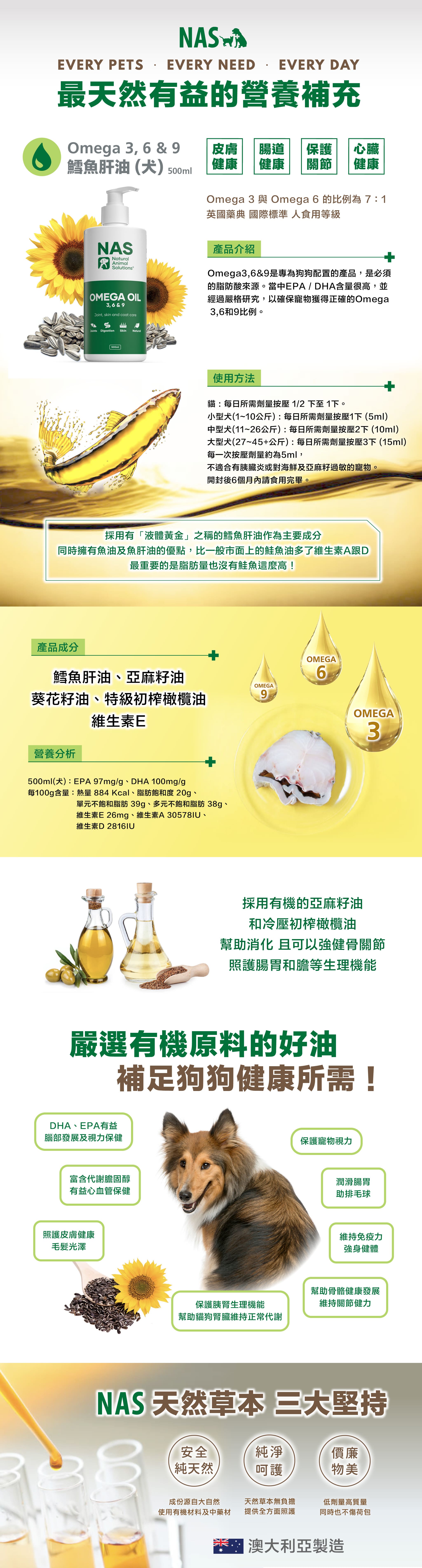 為狗狗精心調配Omega369,採用有「液體黃金」美稱的鱈魚肝油來作為主要成分,它同時擁有了魚油及魚肝油的優點。